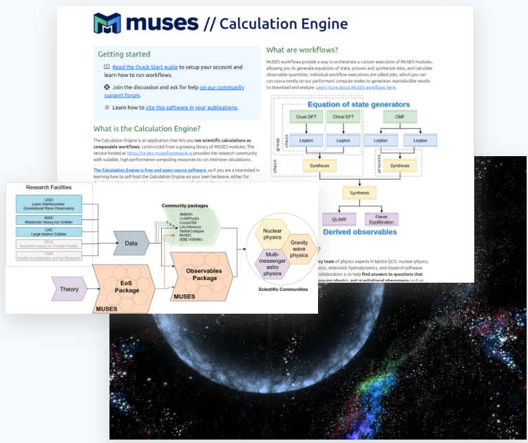 MUSES is an NSF-funded large collaboration project that provides the scientific community novel tools to answer critical interdisciplinary questions in nuclear physics, gravitational wave astrophysics, and heavy-ion physics by developing scientific software modules, deploying web applications to run data processing workflows at scale, and generating scientific data products.